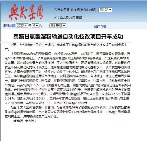 2019年受湖北兴发集团委托,解决该公司年产12万吨甘氨酸的安全输送及干燥自动化问题,同时解决现场VOCs顽疾,由索里德电气、湖北兴发集团与西安交大联合开发,索里德担任设计、中试装置生产并完成测试,后于2022年立项成功实施投入运行,取得良好的经济效益。该技术为国内外首创,颠覆性技术,具有更广泛的推广应用价值。
